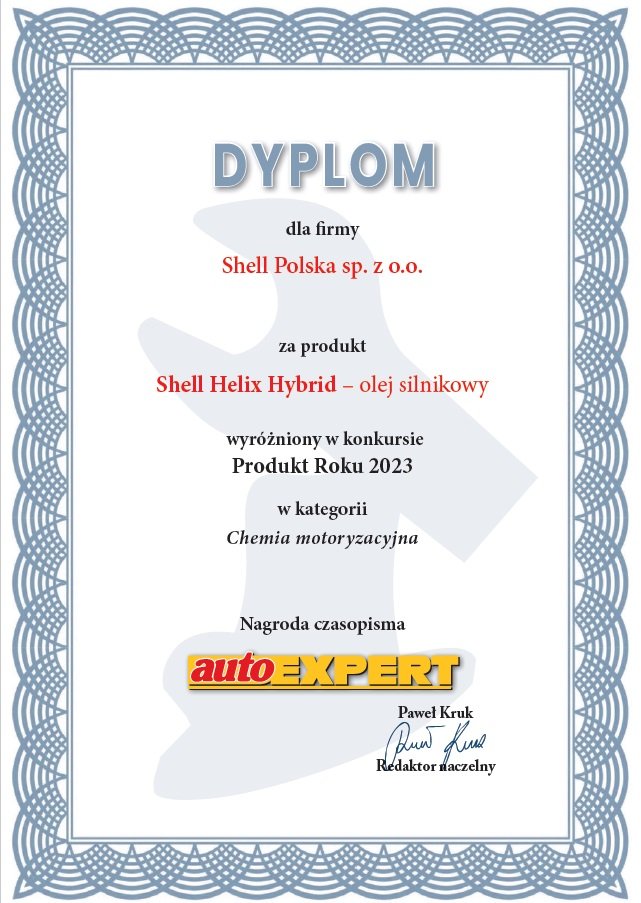 Olej Shell Helix Hybrid zdobył wyróżnienie w 20. edycji konkursu Produkt Roku 2023 magazynu autoEXPERT. Olej silnikowy Shell do pojazdów hybrydowych został doceniony w kategorii Chemia motoryzacyjna.