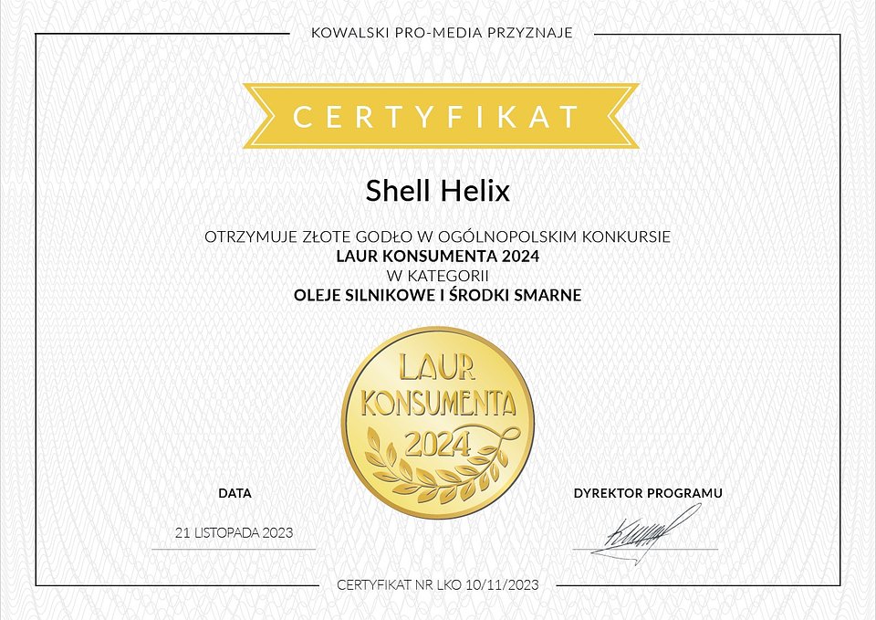 Uzyskany właśnie złoty Laur Konsumenta 2024 to już 17. wyróżnienie z serii Laur Klienta/Laur Konsumenta przyznane marce Shell Helix. W 2023 roku oleje Shell do samochodów osobowych zdobyły też znak „Dobra Marka”, a dostępny w gamie Shell Helix olej do pojazdów hybrydowych Shell Helix Hybrid został wyróżniony w plebiscycie branżowego magazynu „autoEXPERT”.