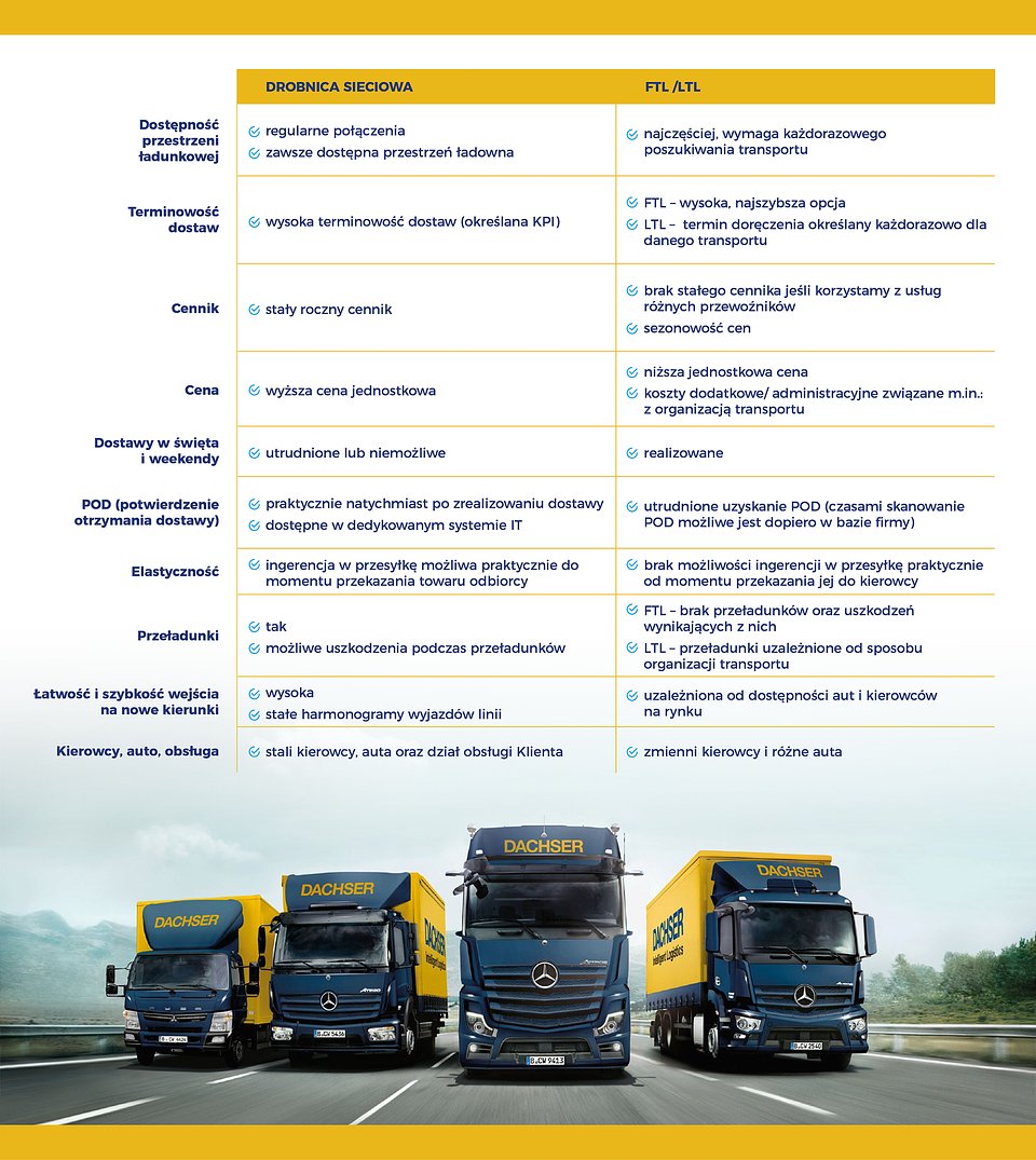Klienci coraz częściej szukają bardziej ekologicznych rozwiązań. Współczesne dostawy drobnicowe, w tym te organizowane przez Dachser, realizowane są za pośrednictwem transportu opartego na kontenerach swap body z podwójną podłogą, przy użyciu których można dostarczyć nawet 76 palet do najbliższego magazynu zbiorczego. Pojazdy obsługujące nadwozia typu BDF zużywają 30-32 litry paliwa na 100 kilometrów, dzięki czemu obciążenie środowiska jest o 85 procent mniejsze na daną przesyłkę niż w przypadku dostawy FTL. Dlatego przy wyborze rodzaju transportu należy wziąć pod uwagę wielkość i masę ładunku.