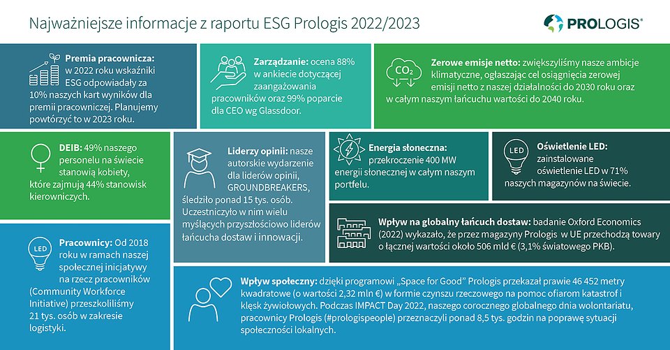Wpływ społeczny: dzięki programowi „Space for Good” Prologis przekazał prawie 46 452 metry kwadratowe (o wartości 2,32 mln €) w formie czynszu rzeczowego na pomoc ofiarom katastrof i klęsk żywiołowych. Podczas IMPACT Day 2022, naszego corocznego globalnego dnia wolontariatu, pracownicy Prologis (#prologispeople) przeznaczyli ponad 8,5 tys. godzin na poprawę sytuacji społeczności lokalnych.