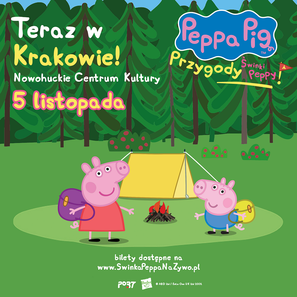 Już 5 listopada br. Świnka Peppa, George oraz przyjaciele zaproszą dzieci na ekscytującą wyprawę do lasu. Mali widzowie razem z bohaterami dobrze znanej kreskówki, będą uczestniczyć w przygotowaniach, podróży oraz przeżywać zabawne perypetie podczas leśnego biwakowania. Nowe „Przygody Świnki Peppy” na scenie Nowohuckiego Centrum Kultury w Krakowie, można będzie obejrzeć tylko podczas trzech spektakli.