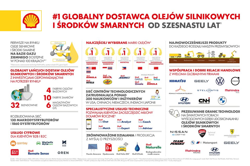 Doroczny raport „Global Lubricants: Market Analysis and Assessment” ukazał się po raz 20. Opracowanie dotyczy danych za rok 2021 i obejmuje rynki w istotnych krajach, gdzie sprzedawane są środki smarne. Zestawienie uwzględnia segmenty rynku, typy oraz rodzaje produktów i formulacje. Shell utrzymuje pozycję numer jeden we wszystkich trzech kategoriach środków smarnych analizowanych przez Kline w rankingu: „consumer automotive” (środki smarne przeznaczone do stosowania w samochodach osobowych), „commercial automotive” (środki smarne do pojazdów użytkowych) i „industrial” (środki smarne stosowane w przemyśle).