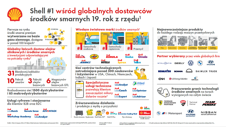 Przygotowywane przez Kline zestawienie „Globalne środki smarne: Analiza i ocena rynku 2025” jest oparte na wolumenie sprzedaży olejów i płynów samochodowych oraz przemysłowych na całym świecie. Zgodnie z danymi z raportu, Shell utrzymał pozycję lidera z globalnym udziałem w rynku na poziomie 11,6%. Kompleksowa analiza produktów z segmentu gotowych środków smarnych obejmuje rozwiązania wykorzystywane w różnych gałęziach przemysłu i motoryzacji, również w kontekście nowych trendów rynkowych, takich jak pojazdy elektryczne (EV) oraz płyny chłodzące do zanurzeniowego chłodzenia (ICF) wykorzystywane w infrastrukturze cyfrowej i energetycznej. Sprzedaż środków smarnych Shell w 2024 roku rozłożyła się następująco: 37% produkty stosowane w samochodach osobowych, 32% produkty przemysłowe oraz 31% – środki smarne do pojazdów użytkowych. Shell ponownie zajął pierwsze miejsce we wszystkich tych trzech kategoriach.